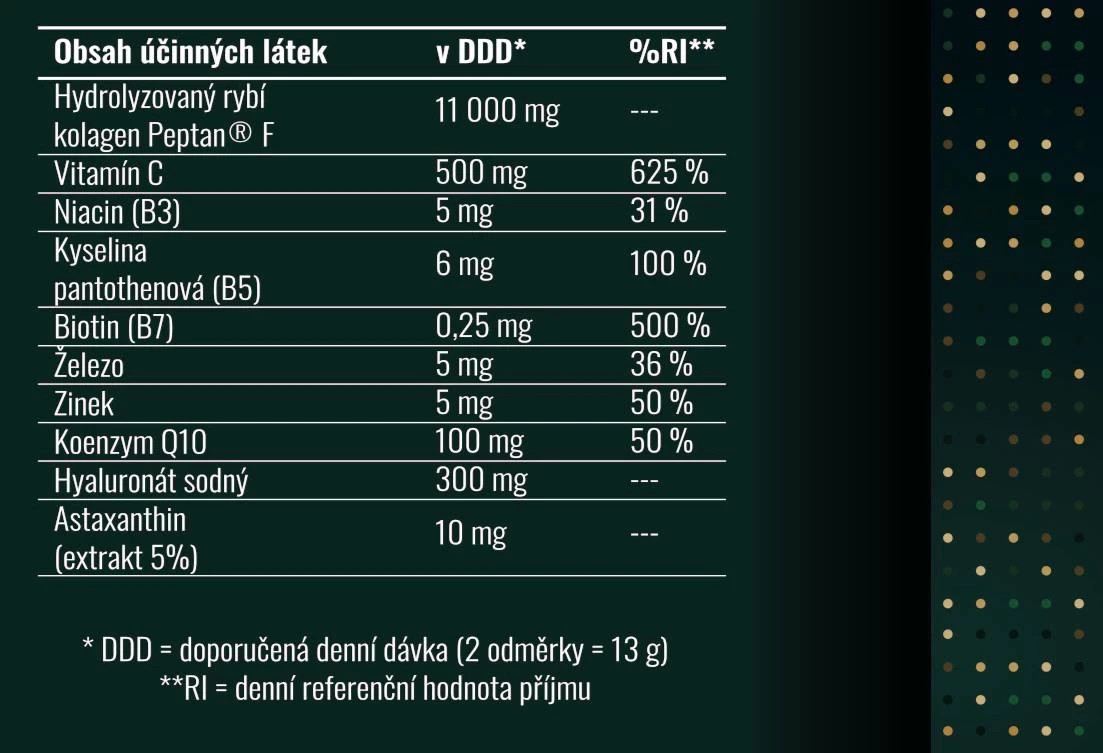 obsahuje na jednu dávku 11 000 mg enzymaticky štěpených peptidů rybího kolagenuPeptan F® té nejvyšší možné kvality.Navíc jejich molekulární hmotnost nepřesahuje 500 - 2000 Daltonů. Tím je zajištěna dokonalá vstřebatelnost a biodisponibilita produktu.